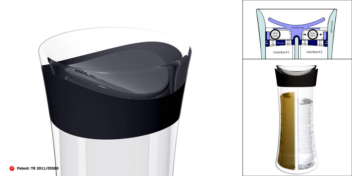Gövde (1) hazne duvarı (1b) ile iki farklı hazneye ayrılmıştır (1c, 1d). Kapak (2), gövde ağzına yerleştirilmiştir ve hazne duvarının üst kenarının (1e) üzerine oturmaktadır. Gövdenin, kapak (2) detaylarını saklayan bir boyun perdesi (1a) bulunmaktadır. Kapak (2), kapak üst kısım (2-1), kapak alt kısım (2-2) ve iki adet taşma valfı (2-3) olmak üzere dört parçadan oluşmaktadır. Kapak üst kısmı (2-1) her iki tarafta iki ayrı çıkışa (2-1a) sahiptir. Kapak üst kısmın (2-1) eliptik şekli (Şekil 3), içeceklerin kapak çıkışlardan (2-1a) akarak gövdenin ağzına gelmesini sağlamaktadır.