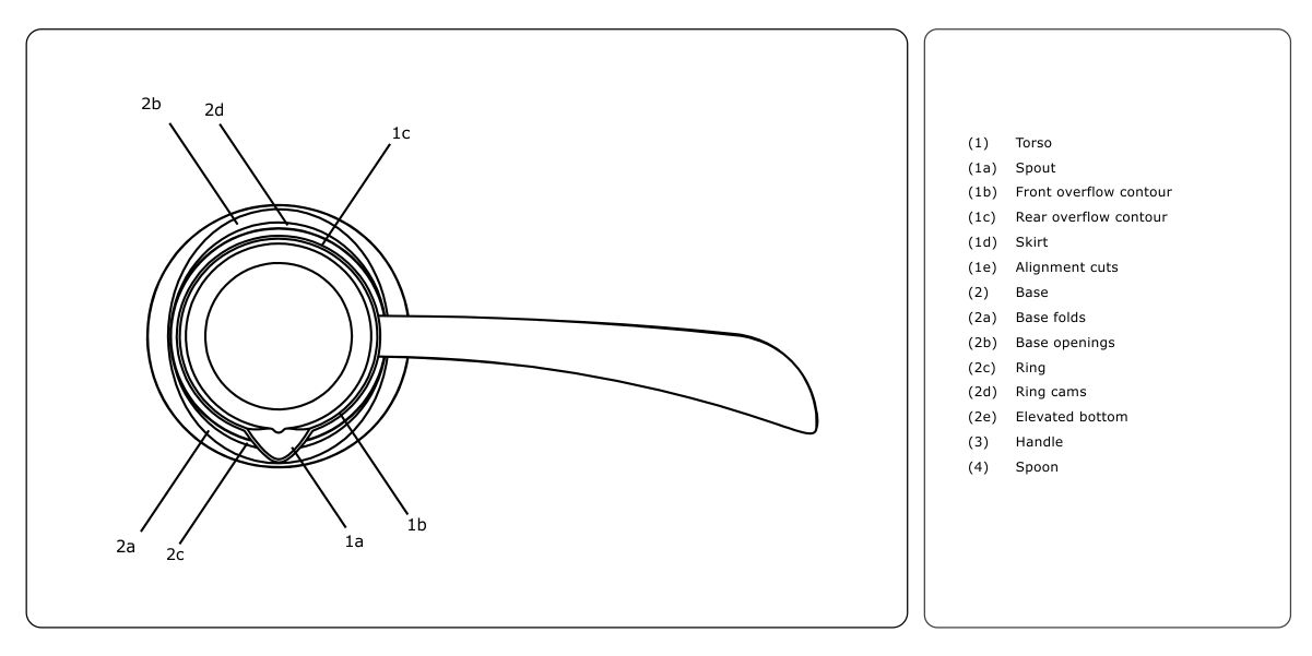 (III) Taşan kısmı toplama özelliği: Isıtma işleminin sürmesi, yani cezvenin ocakta unutulması durumunda altlık suyu buharlaşarak gövde (1) içerisindeki kahve birkaç defa taşabilir; fakat ardından sürekli bir taşma meydana gelmez. Taşmalar ufak miktarlarda olur ve ısı kaynağının gücüne göre taşma sayısı değişir. Gövdenin üst kontur geometrisi sayesinde taşma, ön taşma konturunda (1b) veya arka taşma konturunda (1c) meydana gelmektedir (şekil 5). Taşan kahve, altlıkta bulunan altlık açıklığından (2b) altlık (2) kısmına akmaktadır.